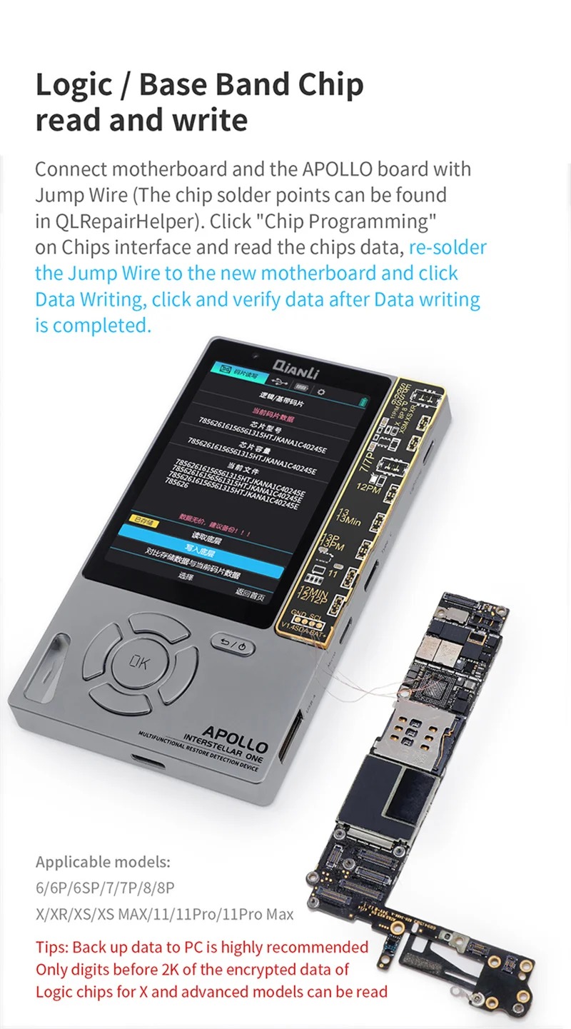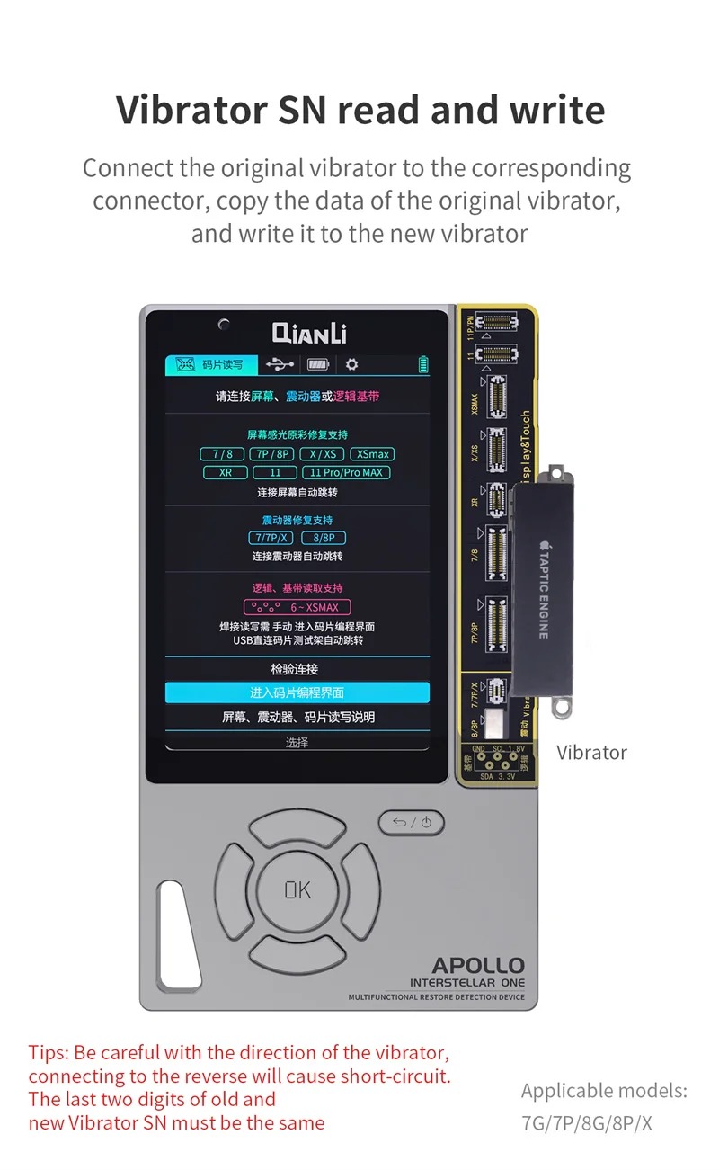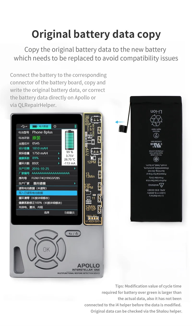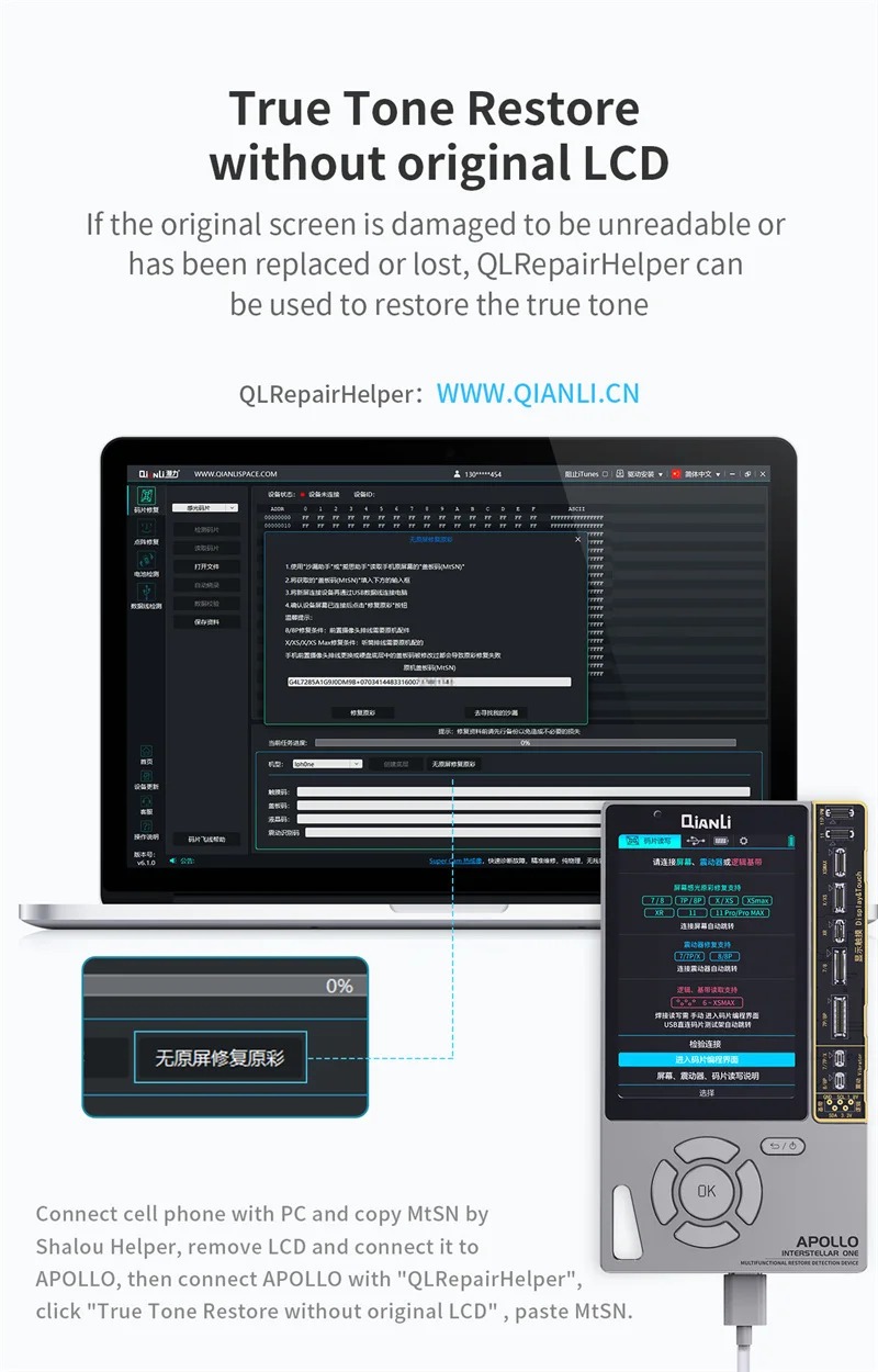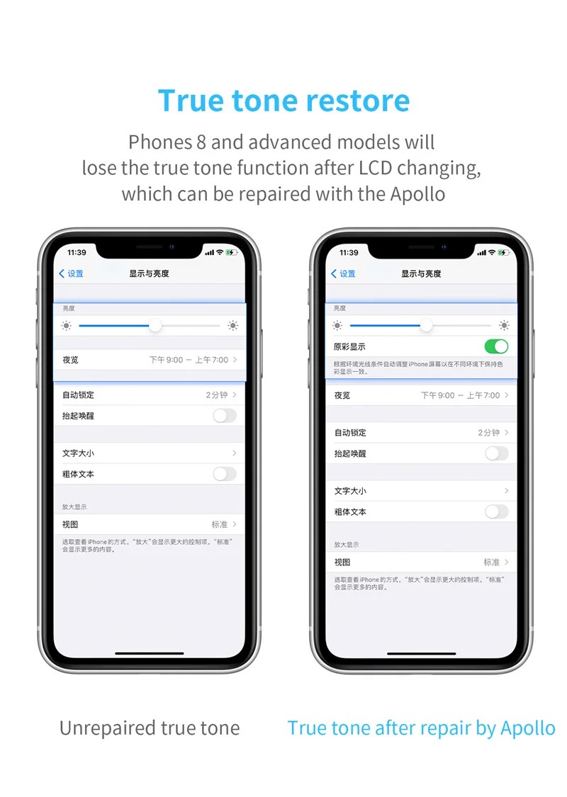 -Truetone restores: Phone 8 and advanced models will lose the true tone function after LCD changing, which can be repaired with the Apollo.