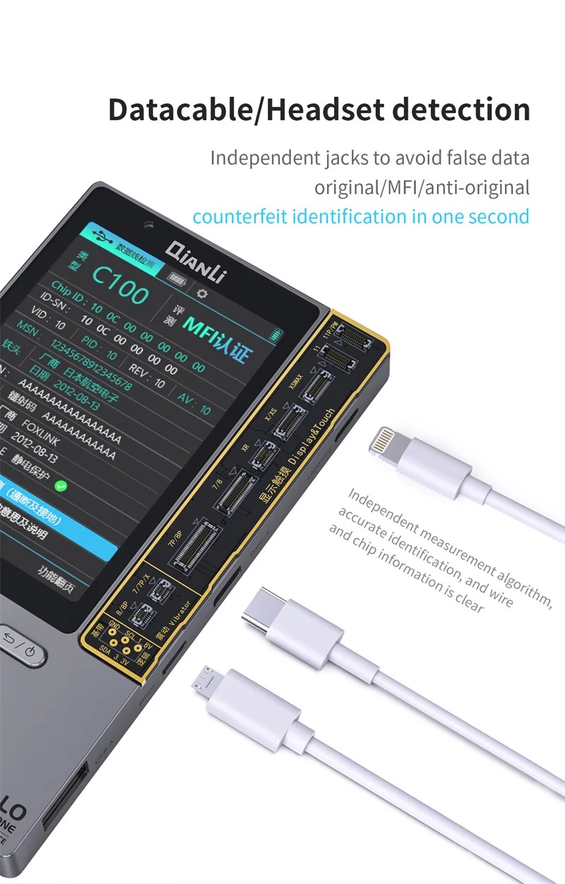 -Detachable/Headset detection: Independent jacks to avoid false data,original/IMF/Anti-original. Counterfeit identification in on the second.