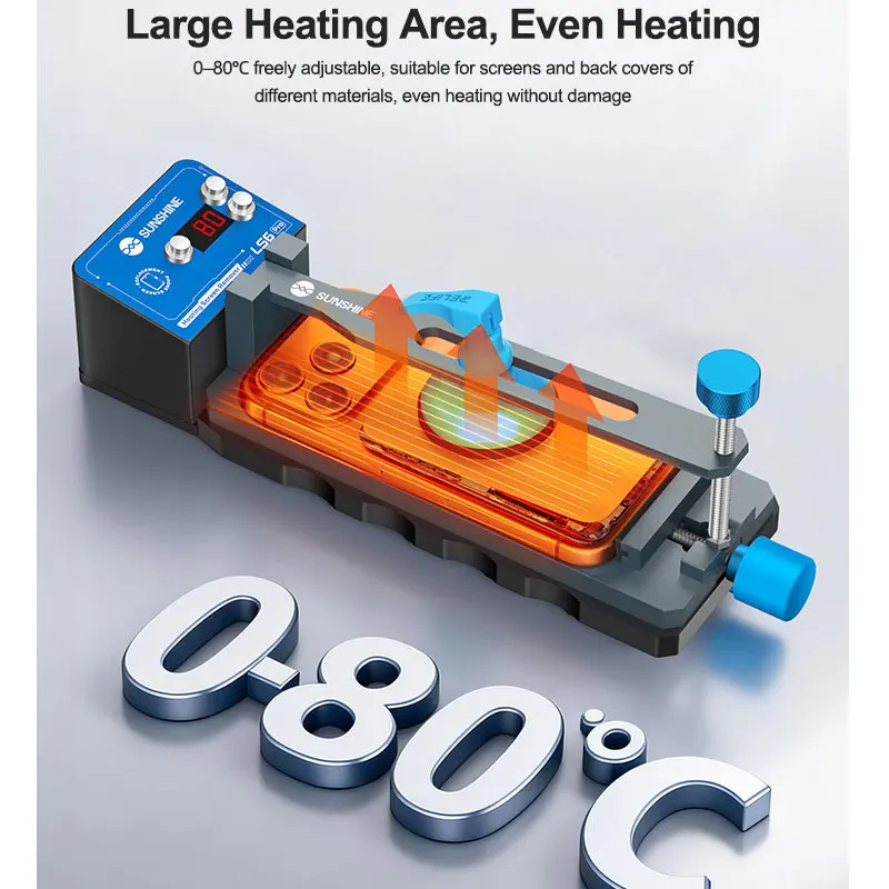 -Large Heating Area, Even Heating: 0-80°C freely adjustable, suitable for screens and back covers of different materials, even heating without damage